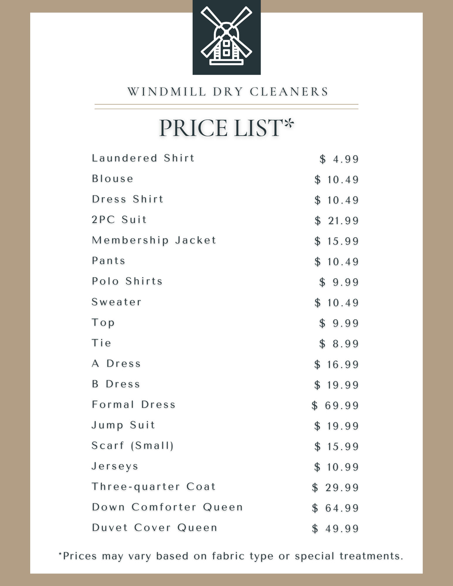 We keep our pricing simple, transparent, and fair. Whether you’re dropping off a dress shirt or a down comforter, you’ll know exactly what to expect — no hidden fees, no guessing. We treat every garment with care and every customer with honesty.